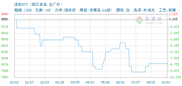 10月10日浙江吉丝关于涤纶DTY的报价为8100元/吨。涤纶DTY的规格:粗细:150D ;孔数:48F ;分类:熔体纺 ;等级:优等品(AA级) ;颜色:白 ;色泽:半消光 ;工艺:低弹 ;。该报价有效期为7天。报价提供方:浙江吉丝新材料有限公司。