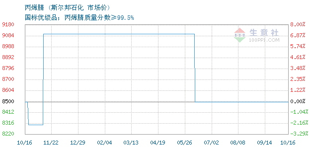 10月16日斯尔邦石化关于丙烯腈的报价为8500元/吨。丙烯腈的规格:国标优级品;丙烯腈质量分数≥99.5%。该报价有效期为3天。报价提供方:济南澳辰化工有限公司。