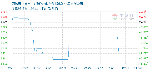 11月02日国产关于丙烯腈的报价为8500元/吨。丙烯腈的规格:含量99.9%,160公斤/桶,塑料桶。该报价有效期为3天。报价提供方:山东兴鹏永发化工有限公司。