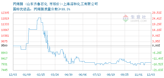 12月03日山东齐鲁石化关于丙烯腈的报价为8100元/吨。丙烯腈的规格:国标优级品;丙烯腈质量分数≥99.5%。该报价有效期为3天。报价提供方:上海溶和化工有限公司。